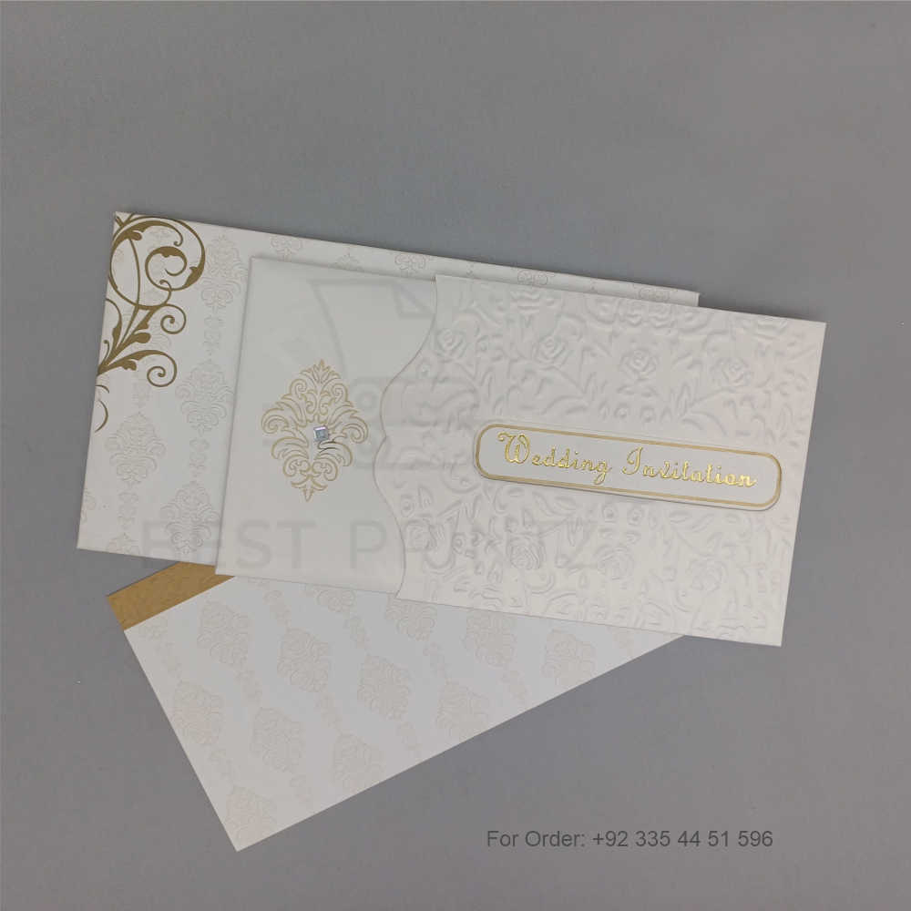 A stylish white wedding invitation card embellished with an elegant gold foil design that radiates luxury and sophistication. The clean white background paired with shimmering gold details creates a timeless and premium look, perfect for classic and modern celebrations. Ideal for couples searching for elegant wedding cards near me, this design offers quality, style, and a memorable first impression for your special day.