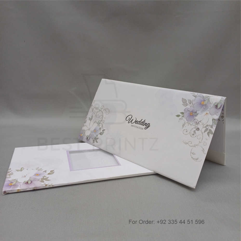 A white wedding invitation card adorned with elegant purple flowers that create a graceful and romantic look. The soft white background beautifully highlights the rich purple floral details, making it perfect for classic and modern celebrations. Ideal for couples searching for premium purple wedding cards, this design offers timeless beauty, quality printing, and a memorable first impression for your special day.