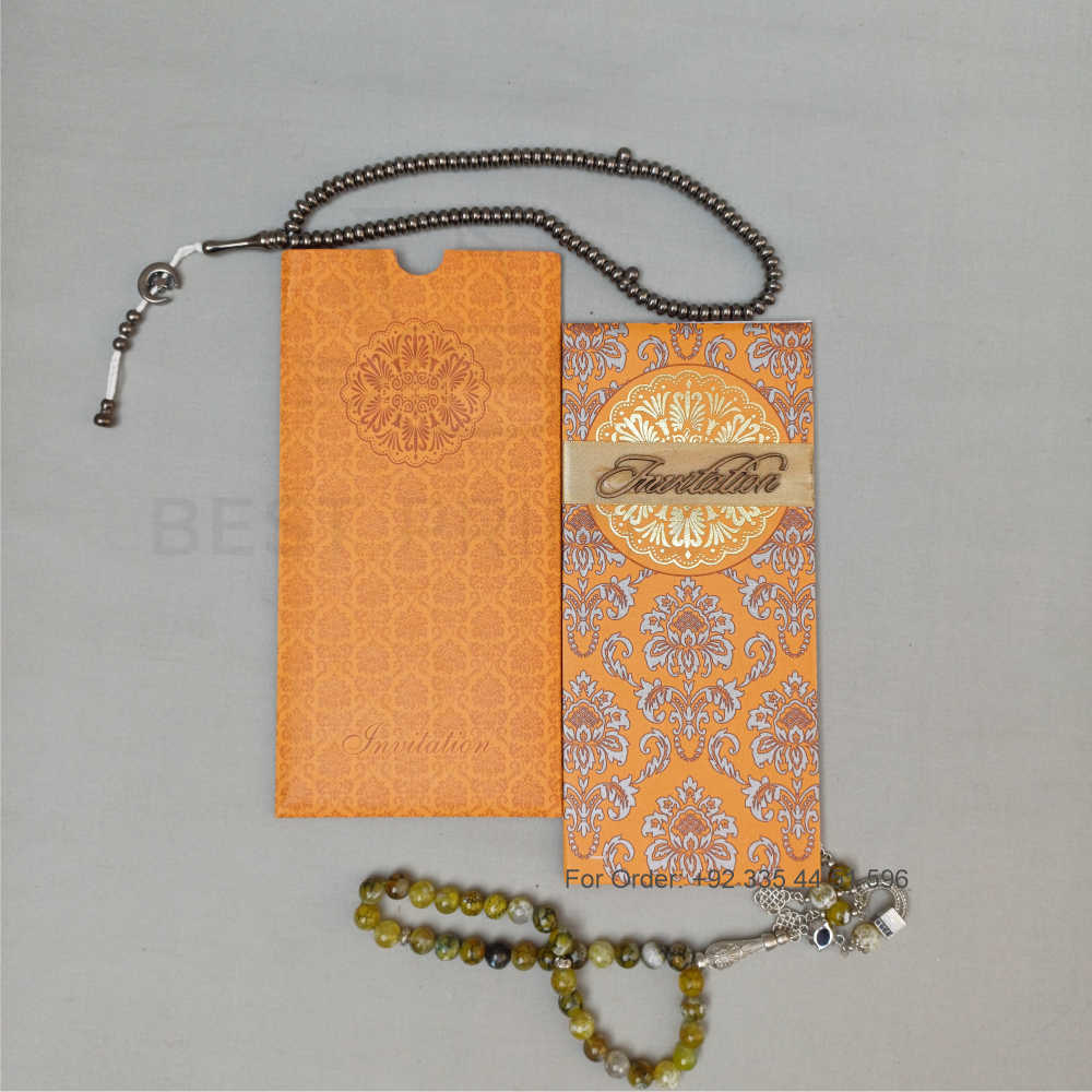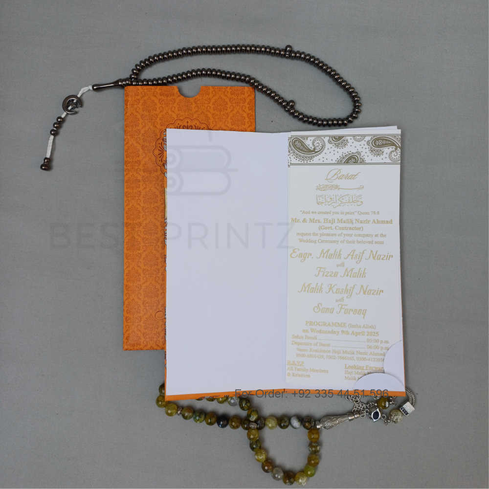 Enhanced with shimmering gold foil accents, intricate patterns, and refined typography, this invitation exudes elegance and sophistication. The harmonious blend of warm orange tones and metallic detailing creates a regal and eye-catching presentation that leaves a lasting impression. Printed on premium-quality textured cardstock, this card offers a luxurious feel and flawless finish — ideal for mehndi, baraat, nikah, walima, or engagement ceremonies.