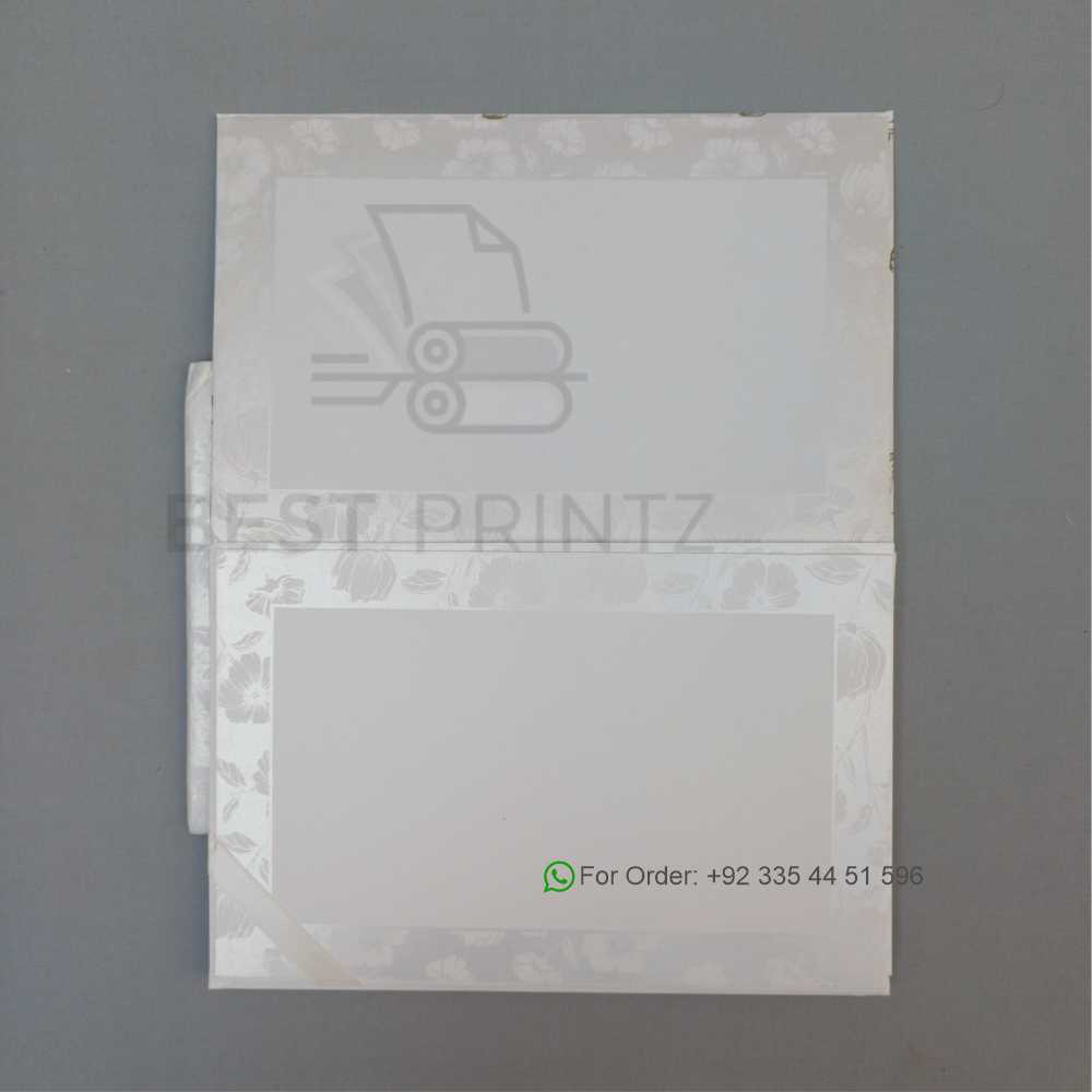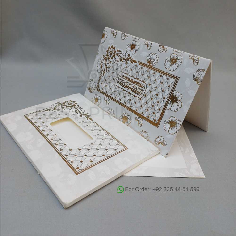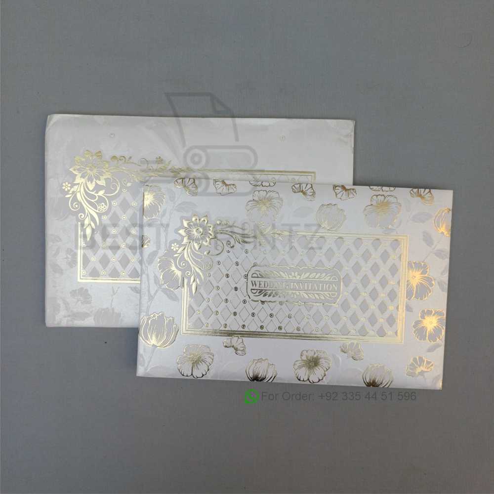 Celebrate your special day with this exquisitely designed luxury wedding invitation. This elegant set features a premium ivory card adorned with shimmering gold-embossed floral patterns and a sophisticated diamond-patterned border. The invitation is perfectly complemented by a matching presentation envelope featuring a stylish rectangular window and intricate gold foil calligraphy. Whether you are searching for wedding cards in lahore or looking for the finest wedding cards in pakistan, our collection offers unmatched premium quality and craftsmanship.