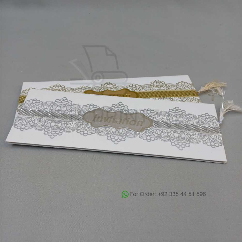 Make a sophisticated first impression with this exquisitely designed luxury wedding invitation. This elegant set features a premium white card adorned with intricate silver and gold lace patterns, a textured mesh band, and a matching tassel for a touch of regal charm. The invitation is perfectly complemented by a clean, minimalist layout with a classic “Invitation” emblem. Whether you are searching for wedding cards in lahore or looking for the finest wedding cards in pakistan, our collection offers unmatched premium quality.