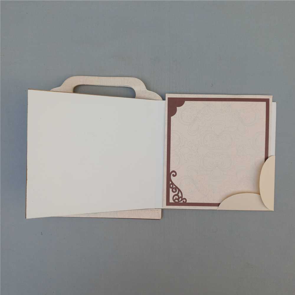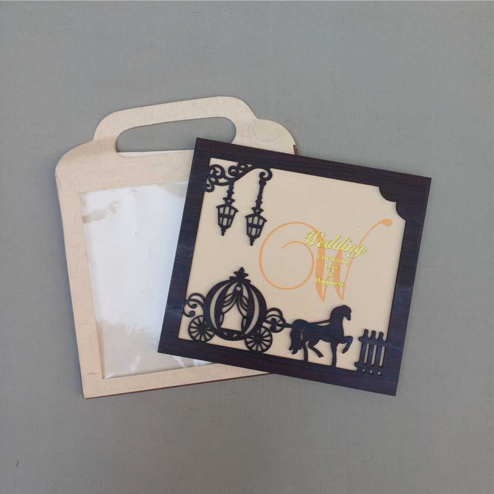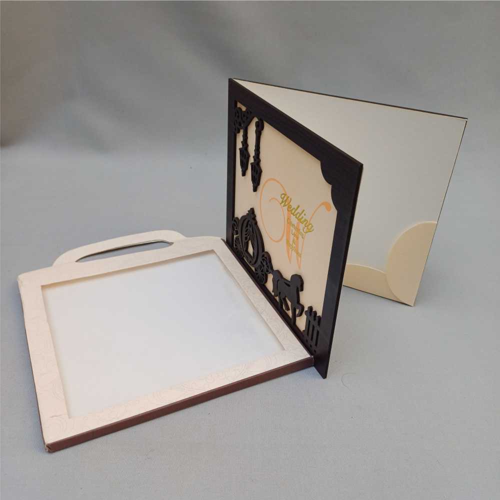 Make a fairytale first impression with this exquisitely designed luxury wedding invitation. This unique set features a premium deep-brown card with an intricate laser-cut silhouette of a royal horse-drawn carriage and hanging lanterns, set against a shimmering gold “Wedding” backdrop. The invitation is perfectly complemented by a matching ivory textured presentation sleeve, featuring a convenient carry handle and a large clear window to showcase the beautiful artistry within. Whether you are searching for wedding cards in lahore or looking for the finest wedding cards in pakistan, our collection offers unmatched premium quality.