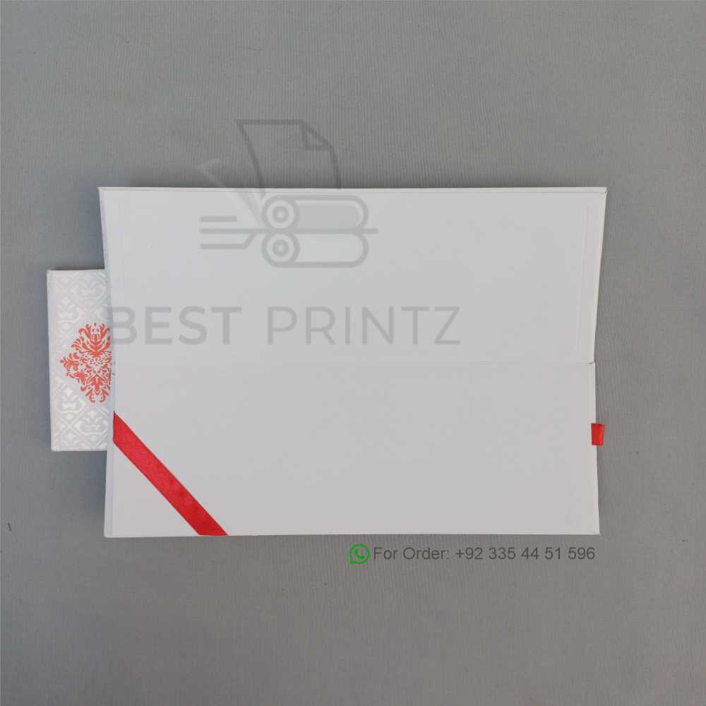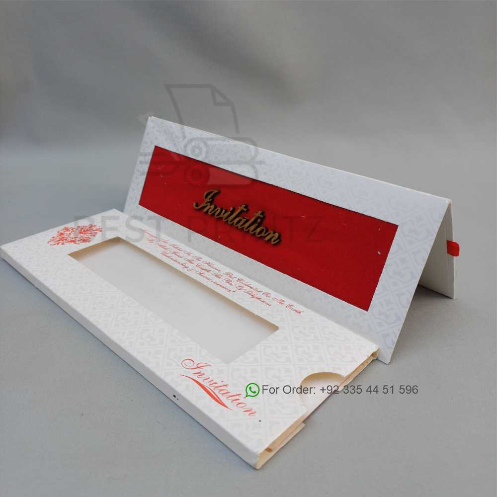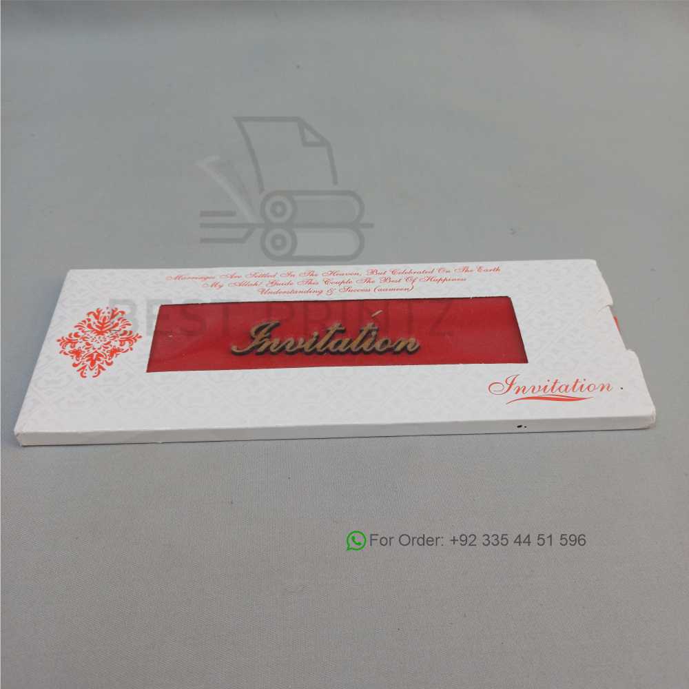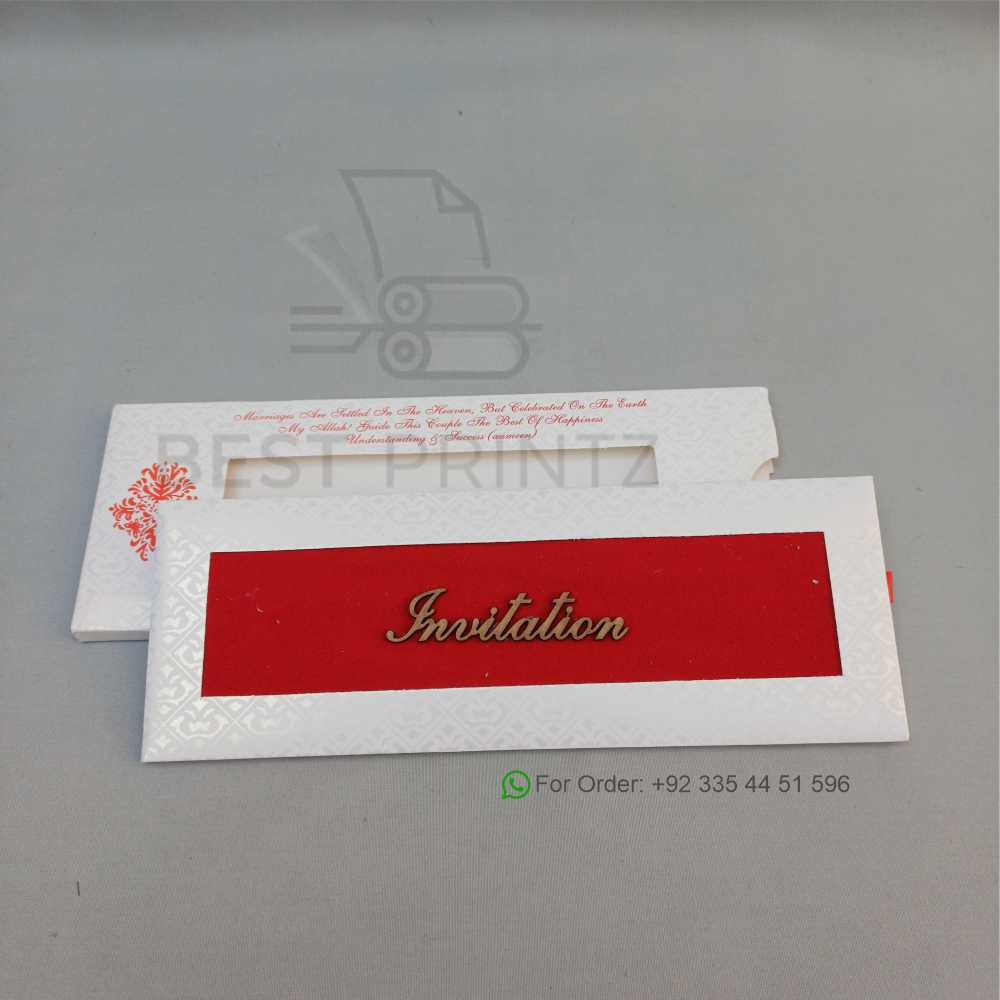 Celebrate your special union with this exquisitely designed luxury wedding invitation. This elegant set features a premium white textured card with a striking red “Invitation” insert and a matching presentation sleeve with a stylish rectangular window. Whether you are searching for wedding cards in lahore or looking for the finest wedding cards in pakistan, our collection offers unmatched premium quality and craftsmanship.
