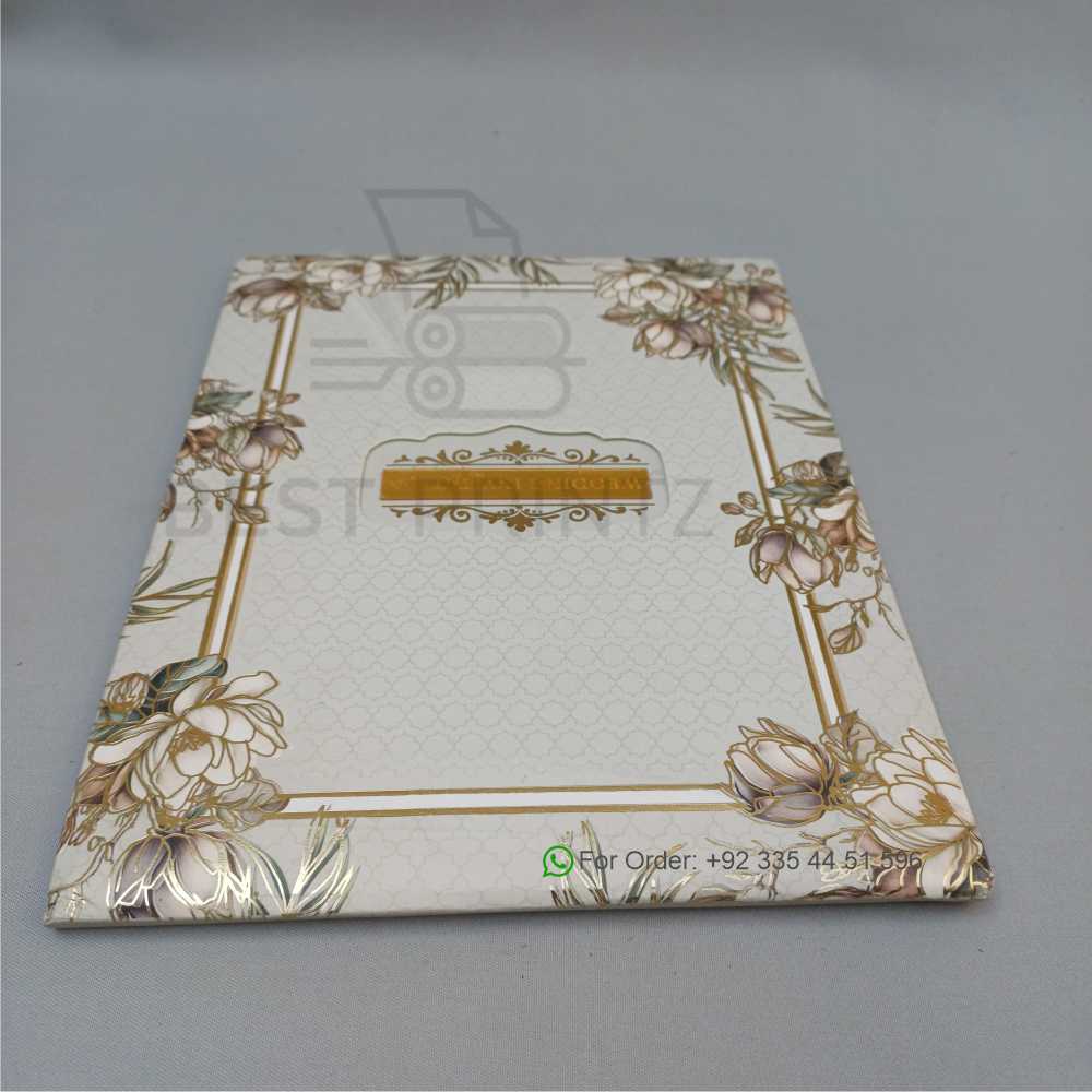 Make your special day unforgettable with this exquisitely designed premium floral wedding invitation. This elegant set features a sophisticated cream-toned card adorned with vintage-style white floral illustrations and a gold-bordered “Wedding Invitation” emblem. The invitation is perfectly accented by a high-quality Shajri Aqeeq prayer bead (Tasbih) and comes with a matching presentation envelope for a touch of spiritual grace and luxury. Whether you are searching for wedding cards in lahore or looking for the finest wedding cards in pakistan, our collection offers unmatched craftsmanship.