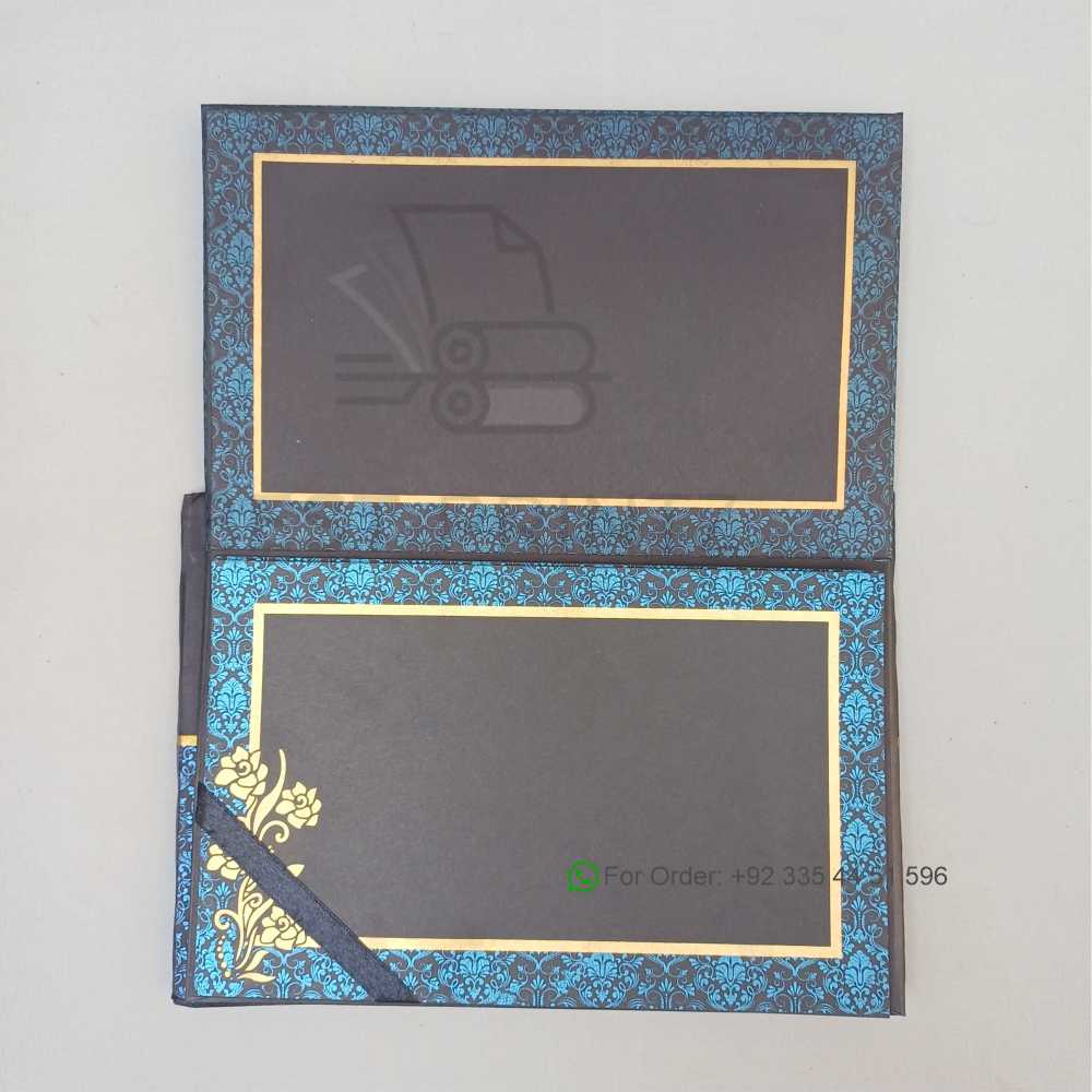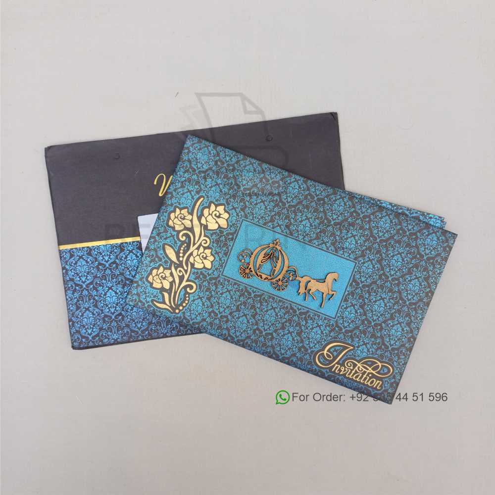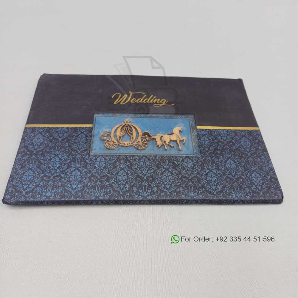 Make a fairytale first impression with this exquisitely designed royal blue and gold wedding invitation. This elegant set features a premium textured card with a sophisticated damask pattern, highlighted by a striking 3D laser-cut silhouette of a royal horse-drawn carriage. The invitation is perfectly complemented by a matching deep blue presentation envelope with gold-foil accents and a stylish rectangular window to showcase the beautiful “Wedding Invitation” calligraphy. Whether you are searching for wedding cards in lahore or looking for the finest wedding cards in pakistan, our collection offers unmatched premium quality.