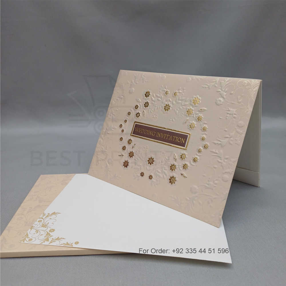 A wedding invitation card embellished with a luxurious gold foil design that radiates elegance and sophistication. The shimmering gold details add a premium touch, making it perfect for grand and classic celebrations. Ideal for couples searching for the best wedding cards, this design combines timeless beauty, quality craftsmanship, and a memorable first impression for your special day.